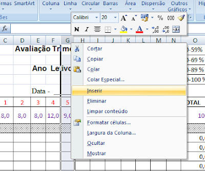 Nada mais fácil!- Clicar com o cursor do rato sobre a letra a seguir ao local onde se quer inserir a coluna (se queremos inserir a seguir à coluna F, clicamos na G);